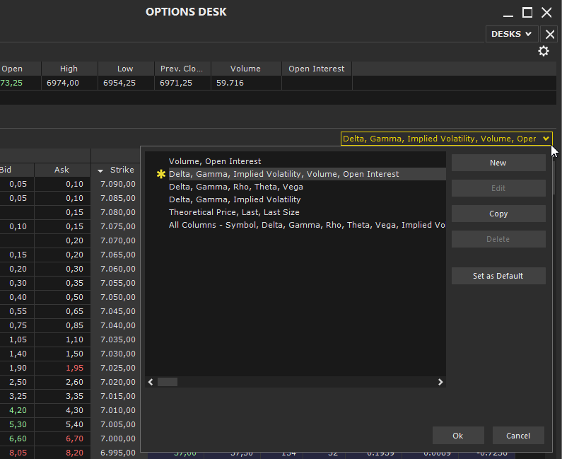 The Options Desk function allows you to view the Option Chains of various instruments. This window enables you to quickly monitor prices, volumes, Greeks, and other key information for both the underlying asset and its related options.