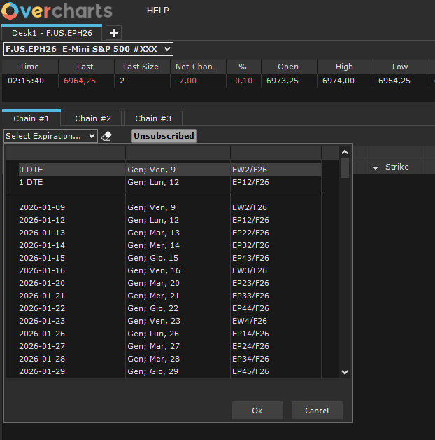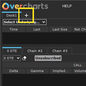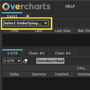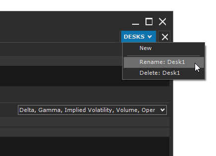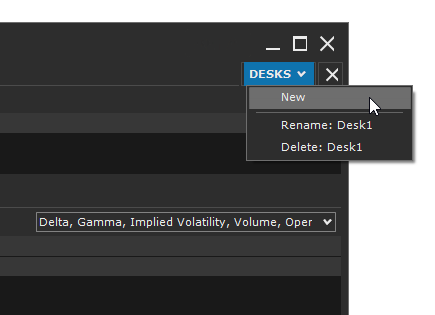 In the Options Desk window, you can create multiple desks, each dedicated to a single underlying. The underlying is selected using the combo-box located at the top left of the window.
