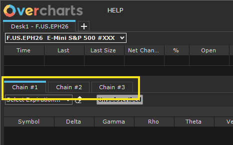 Each desk contains 3 Tabs, each dedicated to a separate Option Chain. For each tab, you can select a different option expiration, allowing comparison across different maturities: