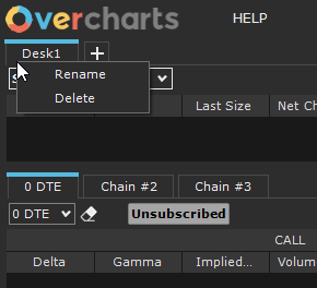 Desks are organized in Tabs, allowing you to quickly switch between underlyings and compare different instruments simultaneously. Each desk operates independently and retains its own display settings and option chain expirations.