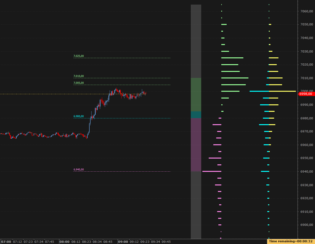 L’indicatore utilizza i dati del limit order book (DOM) e funziona sia in tempo reale sia con i dati storici, se precedentemente salvati nel database locale. All’avvio, se è disponibile uno storico, questo viene visualizzato immediatamente; in caso contrario, l’indicatore inizia a raccogliere i dati DOM in tempo reale, costruendo progressivamente uno storico. I vari livelli di prezzo vengono rappresentati con una colorazione differenziata in base al volume del corrispondente livello del DOM: maggiore è il volume, più intensa sarà la tonalità del colore. Questa rappresentazione, nota come heatmap, è particolarmente utile per individuare potenziali livelli di supporto o resistenza. [Scopri di più]