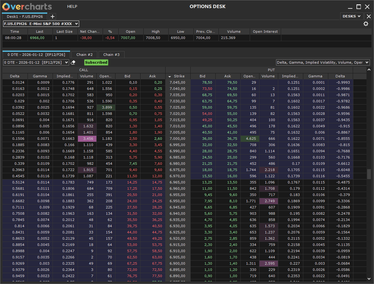 Options Desk è l’ambiente di Overcharts dedicato al monitoraggio e all’analisi avanzata delle Opzioni. Uno strumento progettato per offrire al trader una visione in tempo reale del mercato delle opzioni.